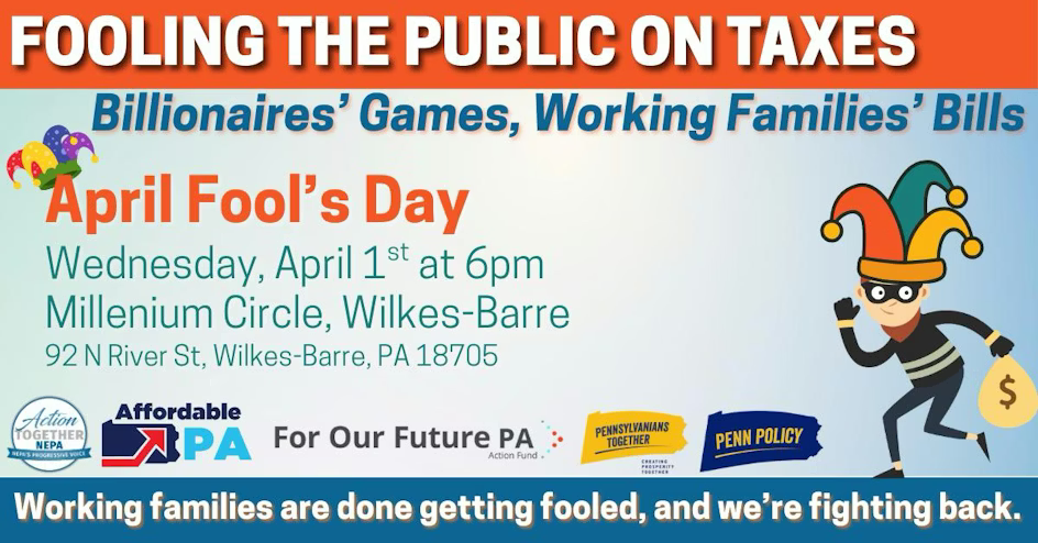 Join Action Together NEPA, For Our Future, Affordable PA, and Pennsylvanians Together for a bold, creative accountability event demanding tax fairness and transparency. Come dressed as a “fool” and bring fun, sharp signs. Let’s make it clear who’s gaming the system — and who’s done being fooled.