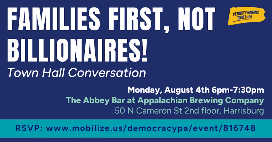 Fair Share America, Pennsylvanians Together, Pennsylvanians Policy Center, 50501, OnePA, Northern Dauphin Democracy Coalition, Workforce PA, Planned Parenthood PA, PA10th District Network, Commonwealth Communications, For Our Future, MomsRising, and our local partners are hosting this town hall because the system is rigged—and it’s time we start fighting back. Join us to share your story, speak your truth, and demand a government that works for us, not just the ultra-wealthy.