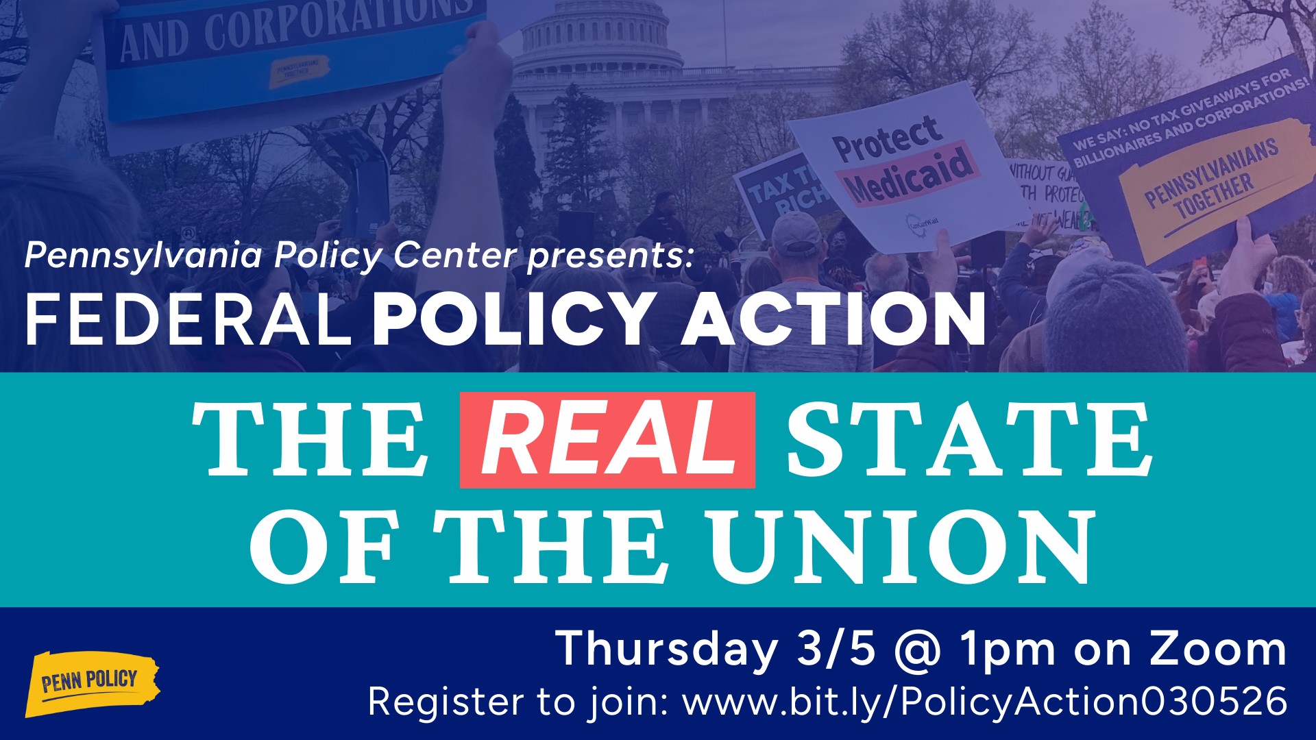 Join us for our March Federal Policy Action call! Cut through the post–State of the Union spin and get the real story on how federal budget and tax decisions impact everyday Pennsylvanians—not billionaires. We’ll break down what’s happening, share legislative updates, and talk through clear next steps to take action together through Pennsylvanians Together: For Our Common Wealth.