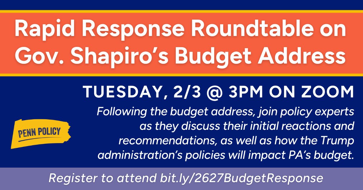 Shortly after Gov. Shapiro’s address concludes, PA Policy Center will host an online discussion with leaders in advocacy efforts, offering their reactions & responses to Gov. Shapiro’s proposed budget for 2026–27. The forum is tentatively scheduled for 3PM, but might be adjusted depending on the timing of the Address, so if you , we’ll send a reminder email to confirm the exact start time as the event approaches.