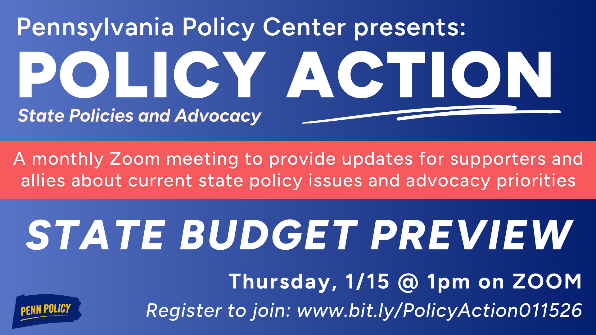 Join us on Thursday, January 15, at 1 p.m. on Zoom for an informative conversation with leaders in efforts to advocate for state government investments that benefit all Pennsylvanians.
