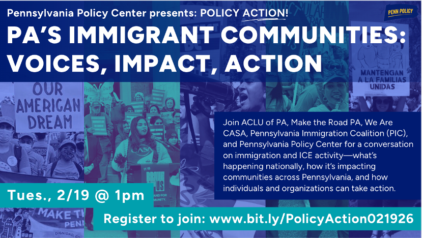 Join us on Zoom for our Joint Federal and State Policy Action Call on Thursday, February 19, at 1 p.m.! REGISTER HERE to receive the Zoom link! We'll have federal-level and state-level immigration updates for you, and we'll talk about "One Big Beautiful Bill Act" accountability for more than $74 billion going to ICE (Immigration and Customs Enforcement). ICE is killing people, and Congress is funding it. Individuals and organizations are searching for ways we can protect our neighbors, families, and friends in this moment. We want to provide a national update, discuss what it looks like in Pennsylvania, and leave you with a call to action. Pennsylvanians Together will be joined by the ACLU, Make The Road PA, CASA, and PIC (Pennsylvania Immigration Coalition). Don't forget to REGISTER HERE.